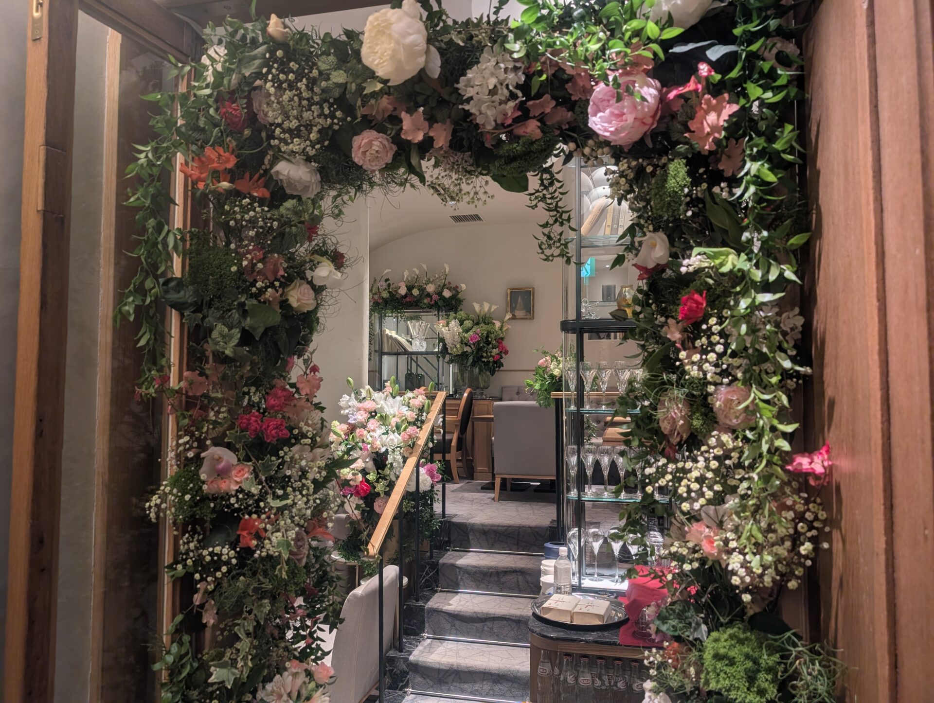 店内は祝花で埋め尽くされ、普段の凛とした空間とは異なる柔らかさに包まれていました。